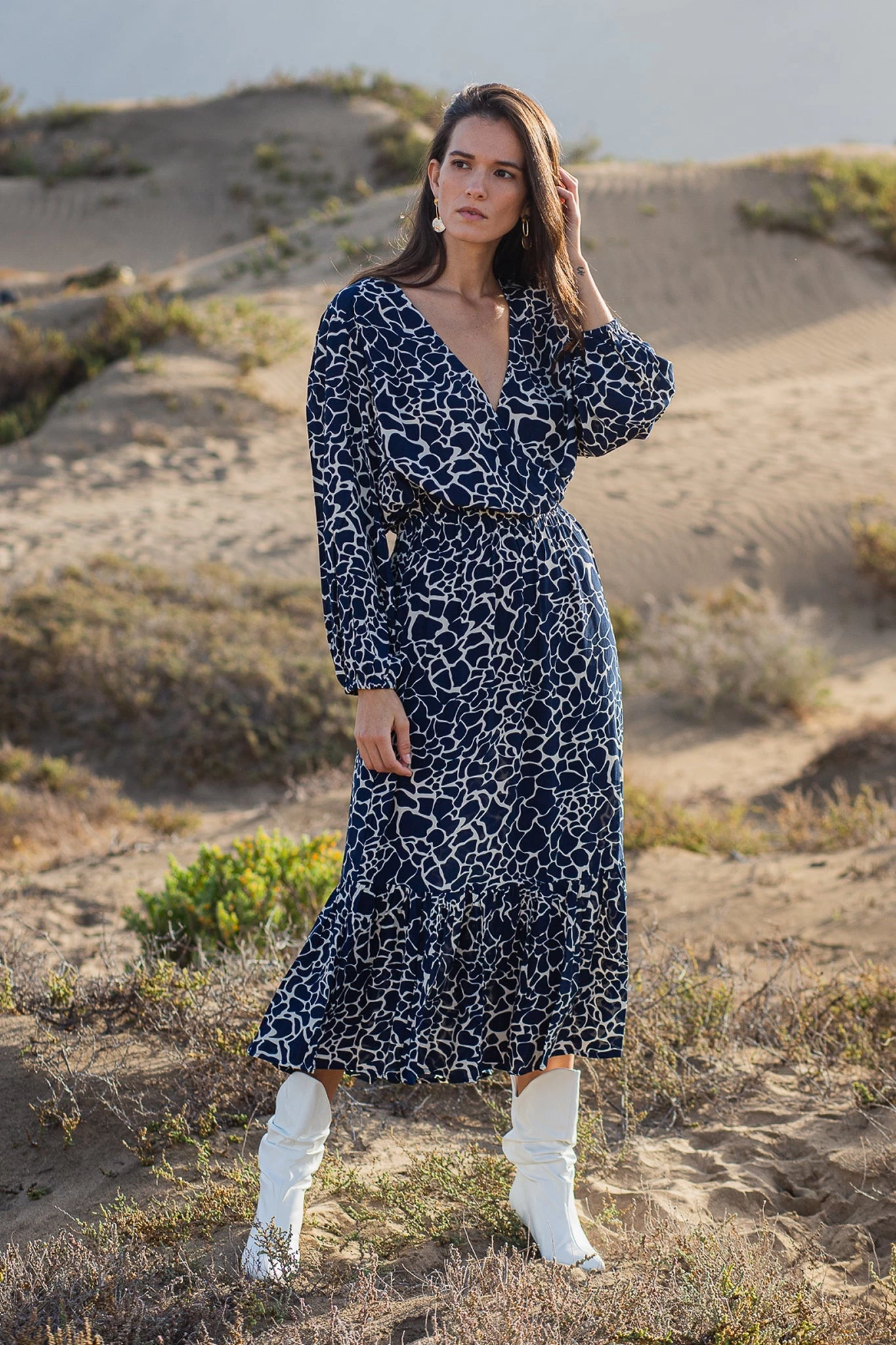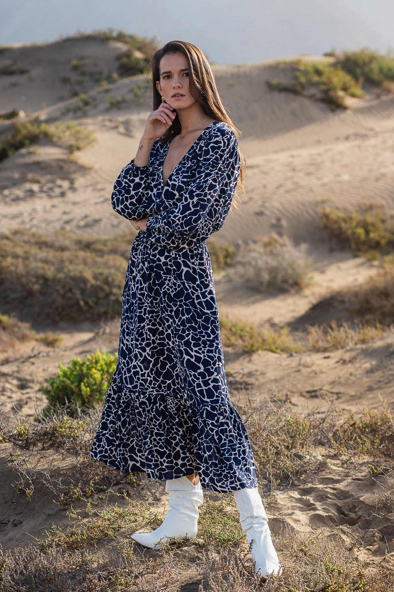 Babett features a cinched waist to highlight your curves and the lightweight fabric is flowy enough to bring attention to the relaxed fit. It has a plunging V neckline with long sleeves and a ruffled hemline ending shortly above the ankles. We suggest styling it with all your favourites in the closet.