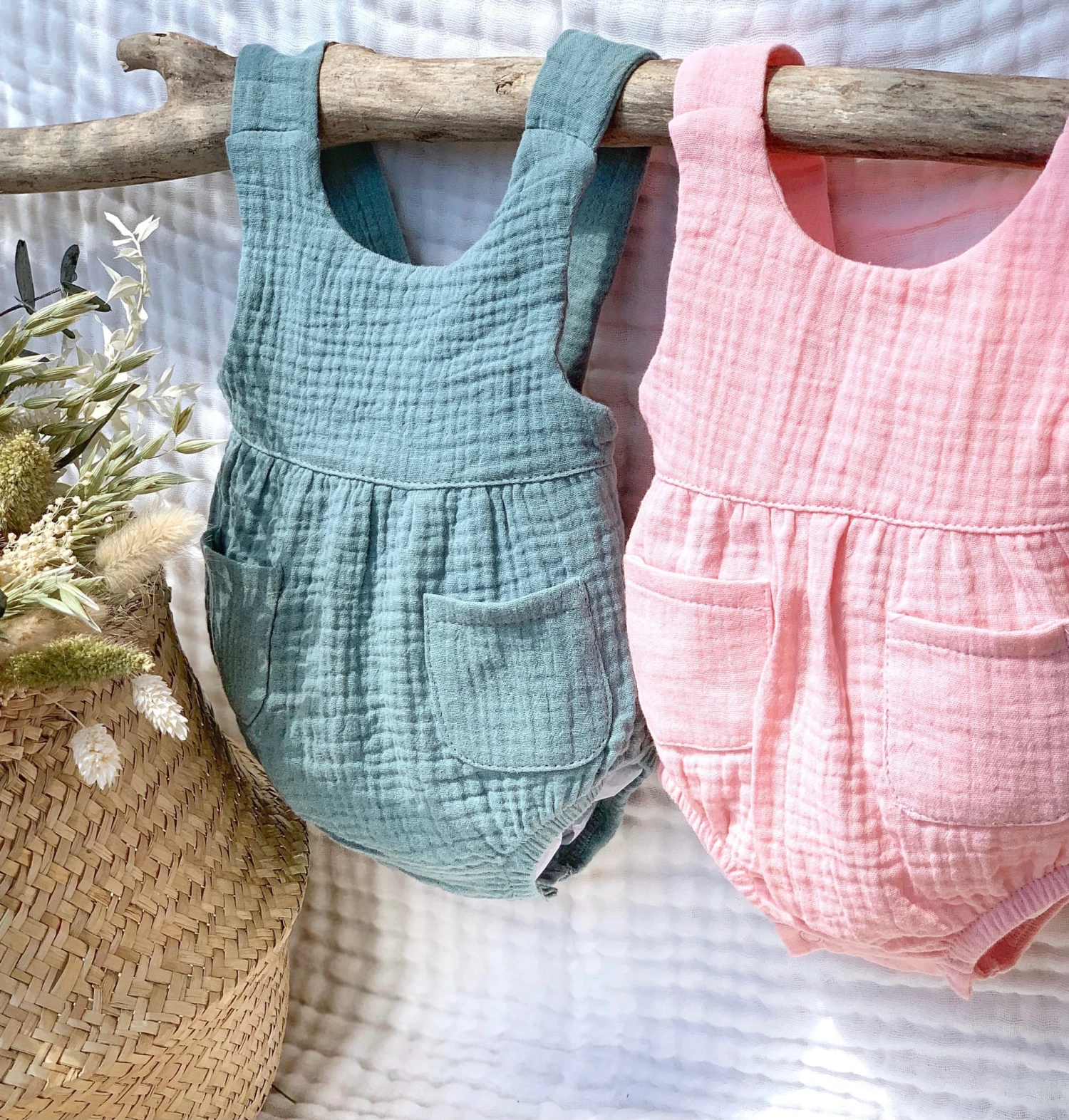 La nouvelle barboteuse « la prairie » est la pièce parfaite pour l’été de votre bébé. Déclinée en vert eucalyptus ou en rosée pêche, elle se porte seule ou s’associe très bien avec un petit haut ou un body à col. En double gaze de coton biologique, ce sera un indispensable des beaux jours.