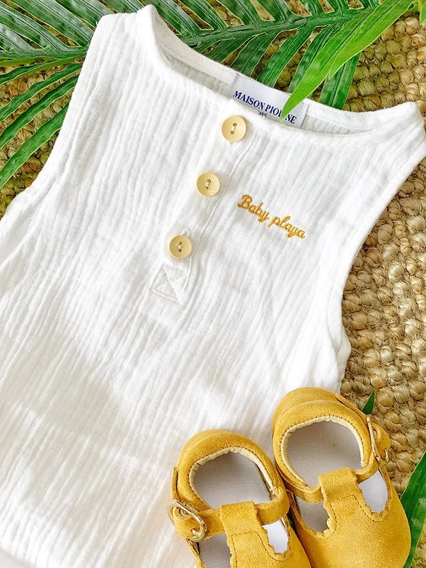 Notre jolie barboteuse blanche est 100% coton. Elle est très agréable à porter avec sa matière en gaze de coton pour les belles journées d’été. Pour un petit look « bord de plage », on craque ! De plus, elle dispose de 3 jolis boutons en bois naturel et de 3 pressions au niveau de l’entrejambes permettant un change facile.