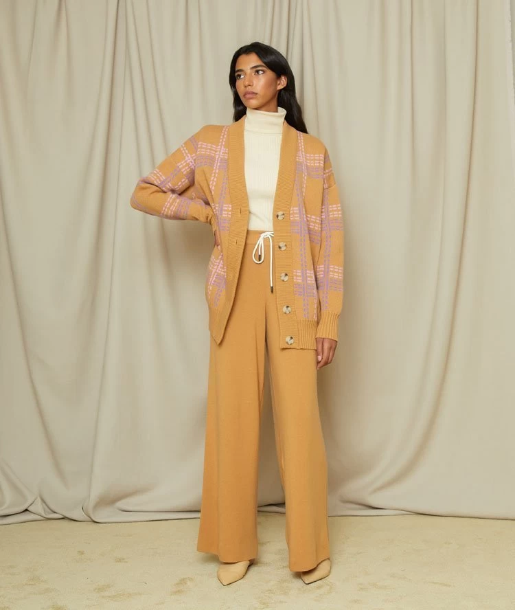 Repéré sur Gigi Hadid la saison dernière, notre cardigan en jacquard fait son retour avec un nouvel imprimé géométrique et une nouvelle combinaison de couleurs. Ce cardigan à carreaux camel, mauve et rose est tricoté pour une coupe structurée.