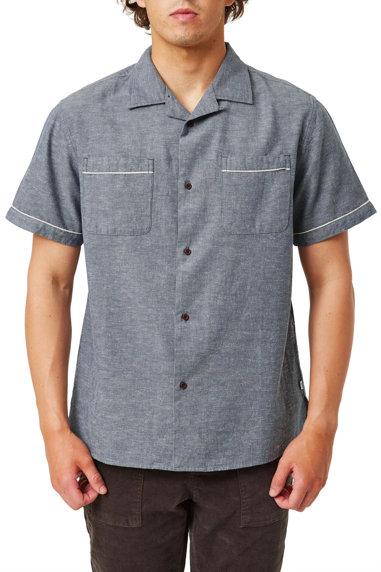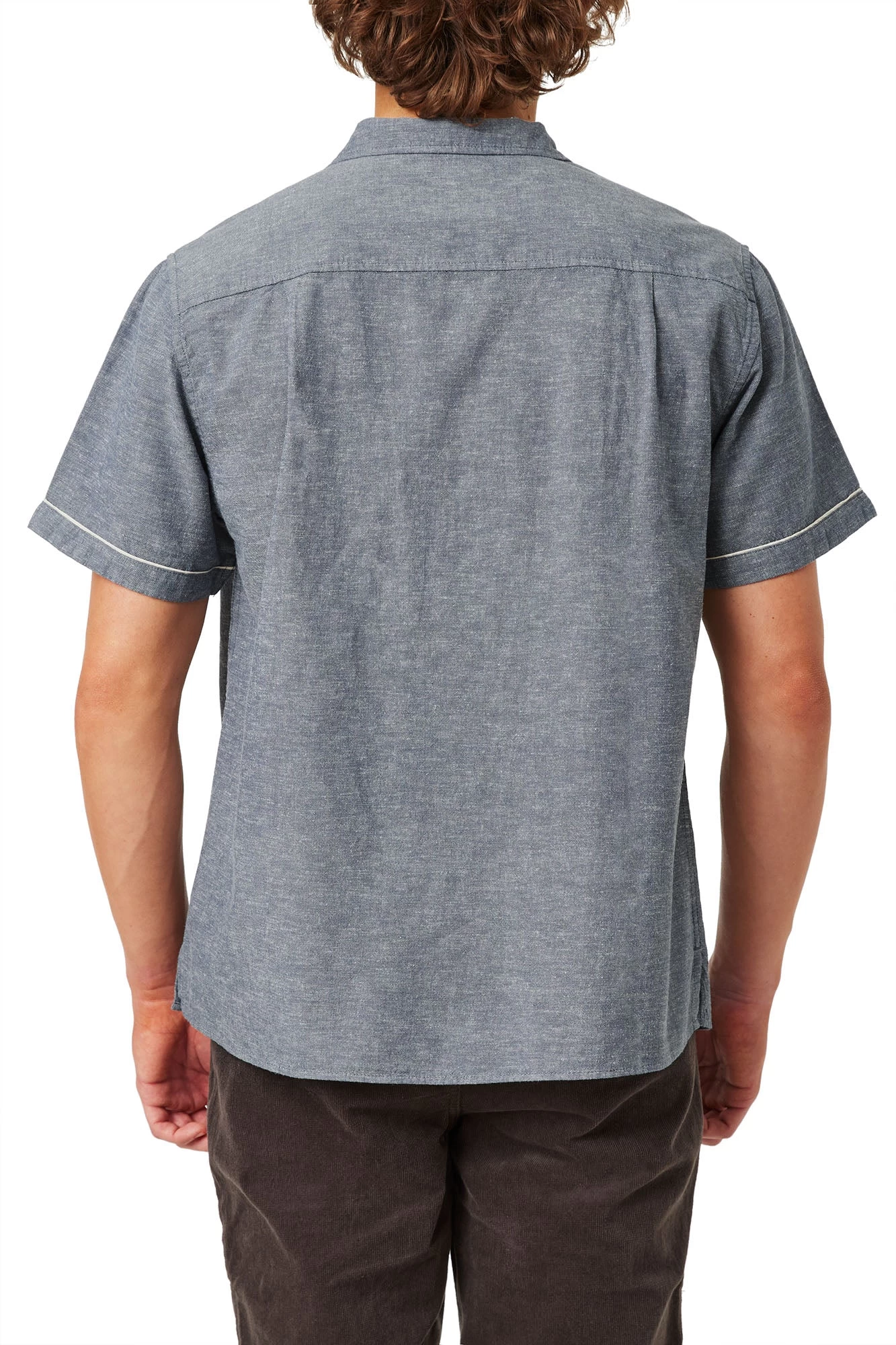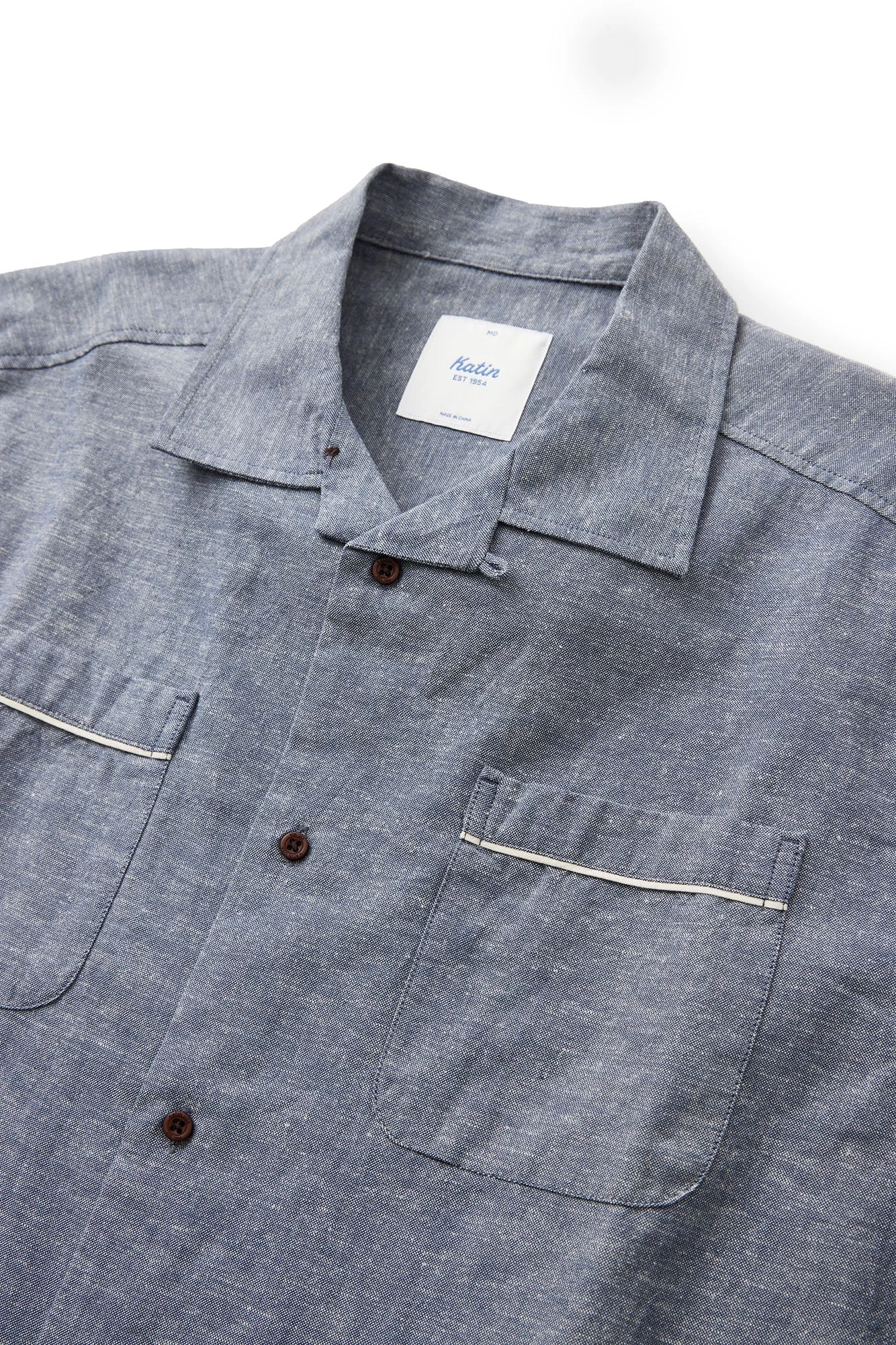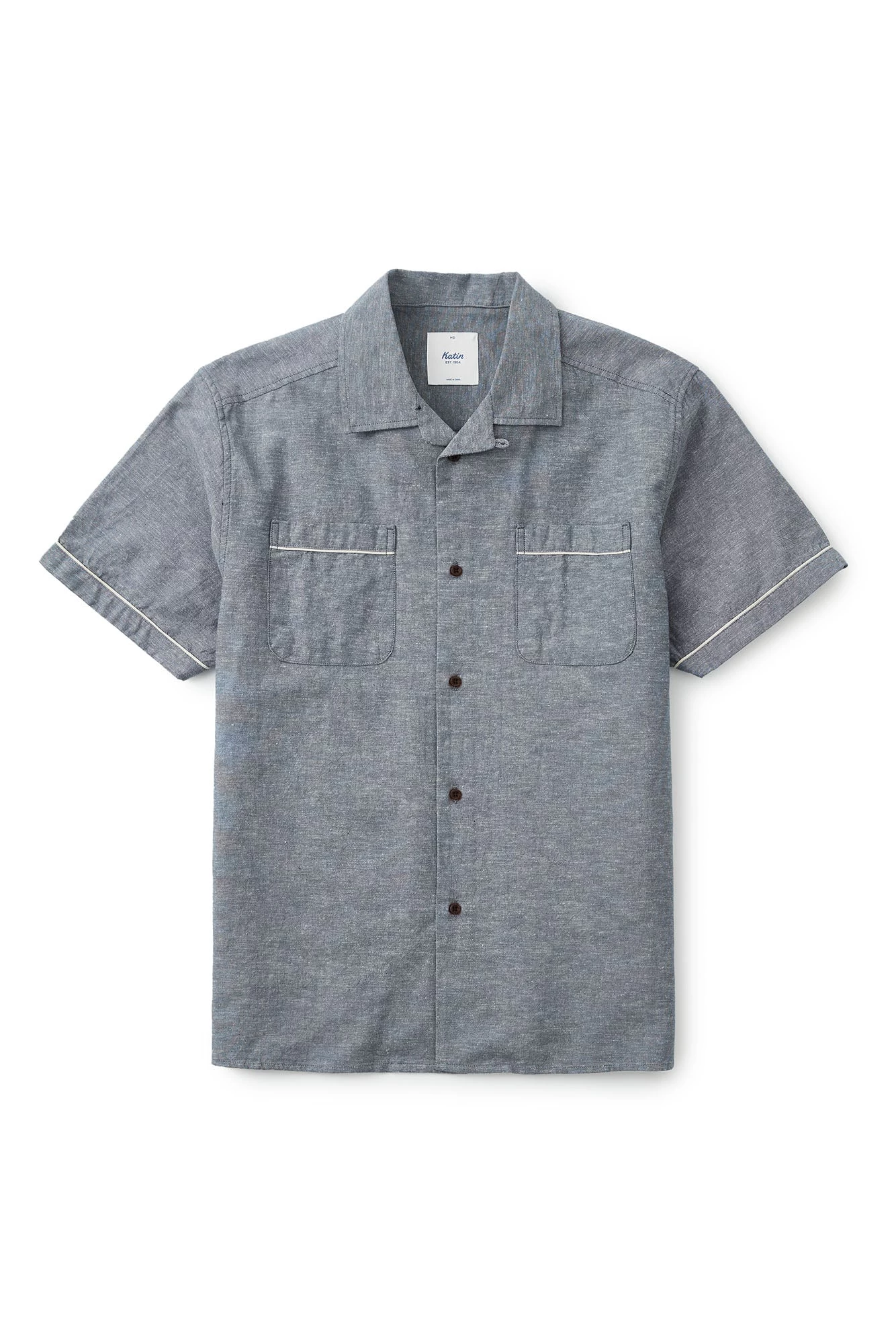 The Roy Shirt features a custom vertical stripe atop of breathable cotton and linen in a 75/25 blend.