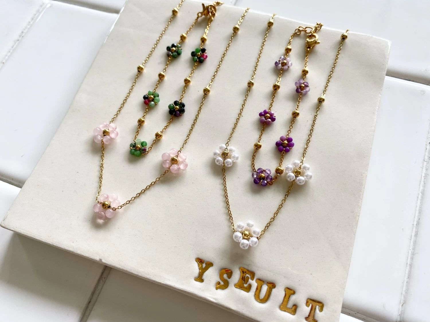 Collier en acier doré inoxydable & marguerites perles d’eau douce