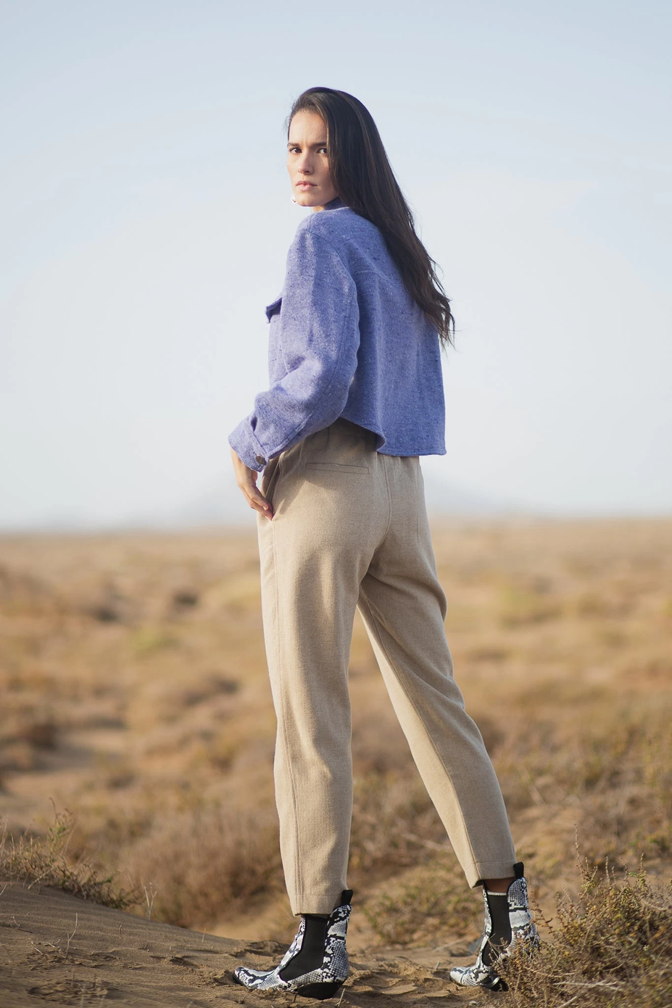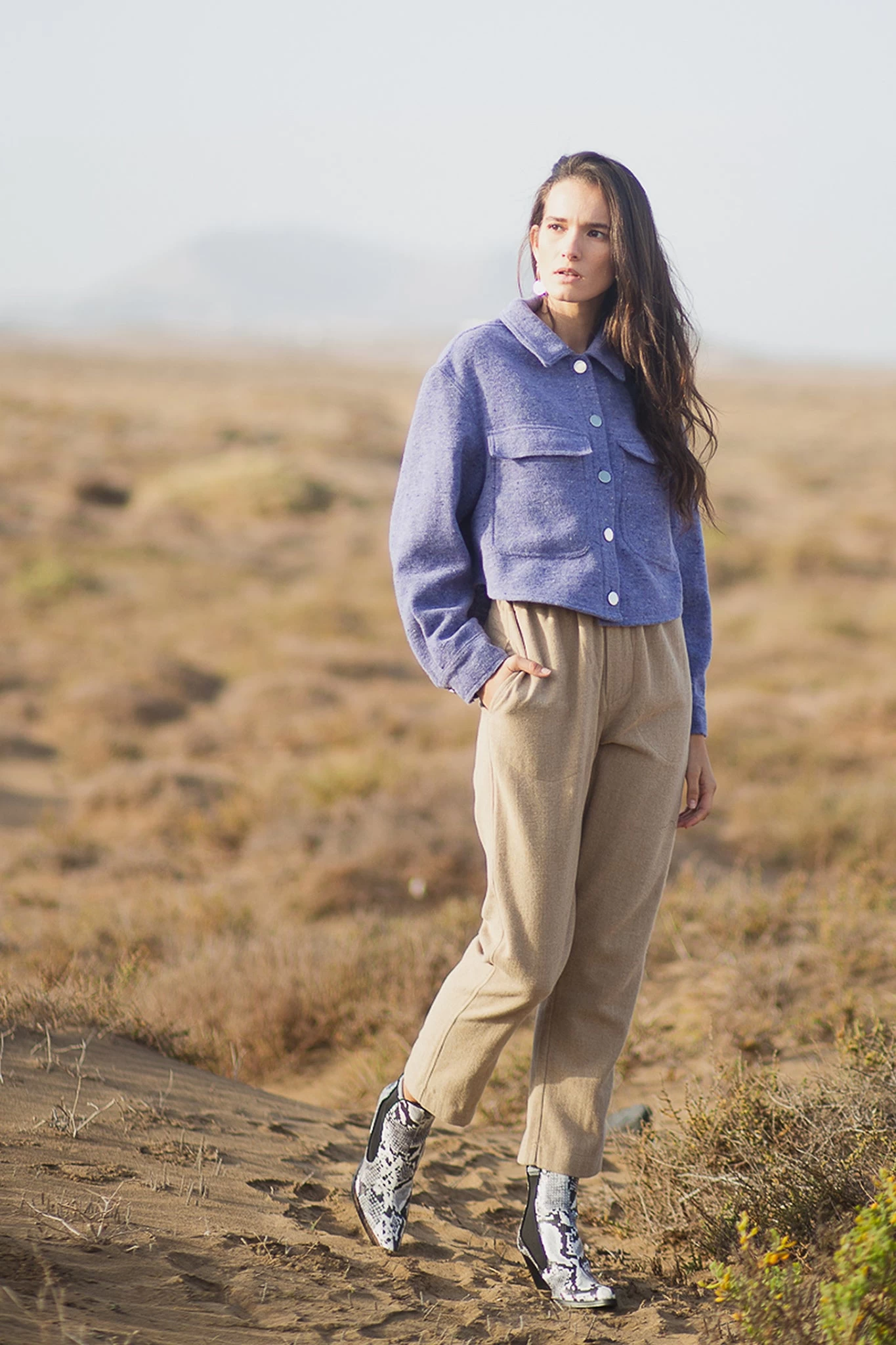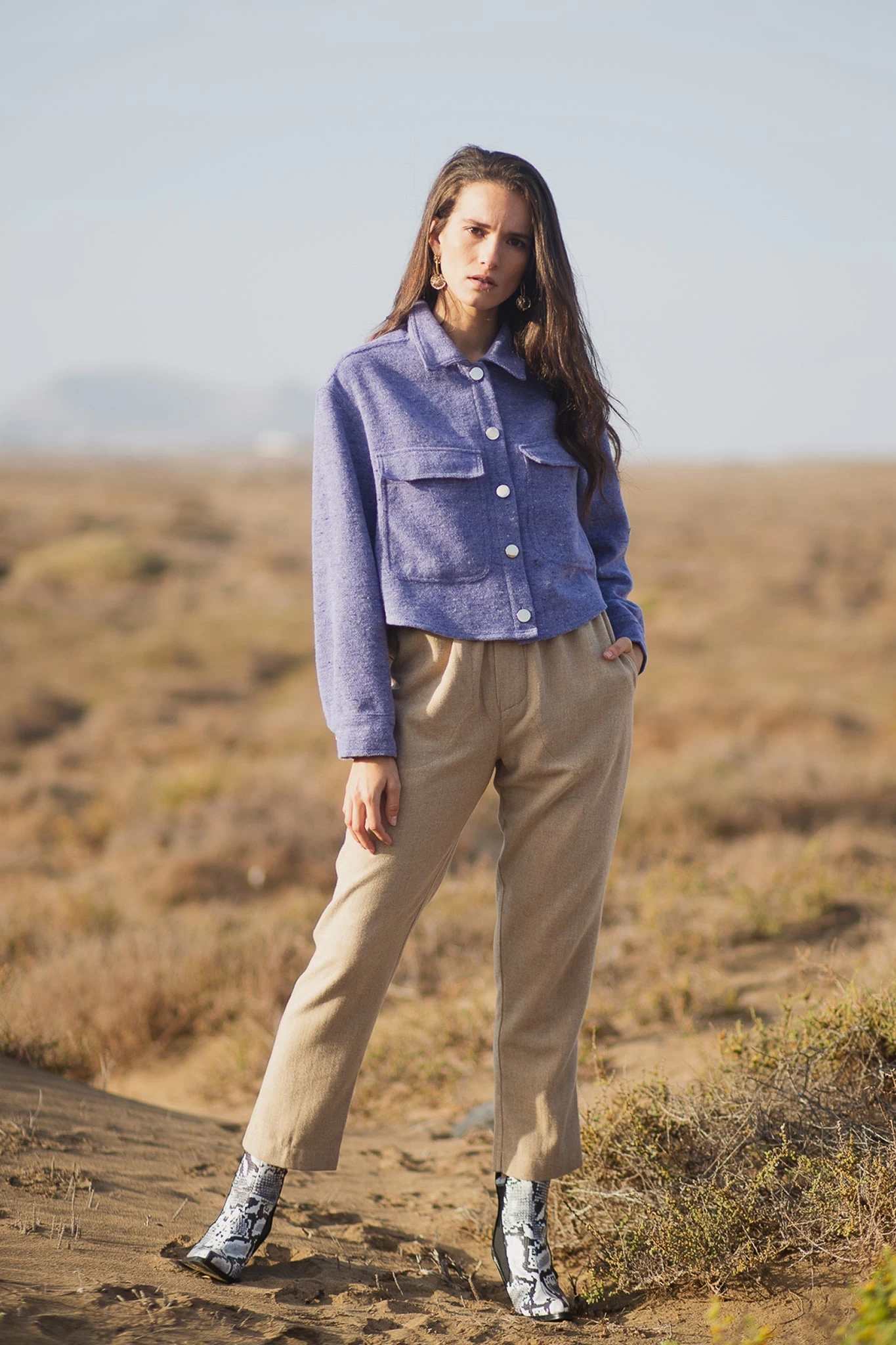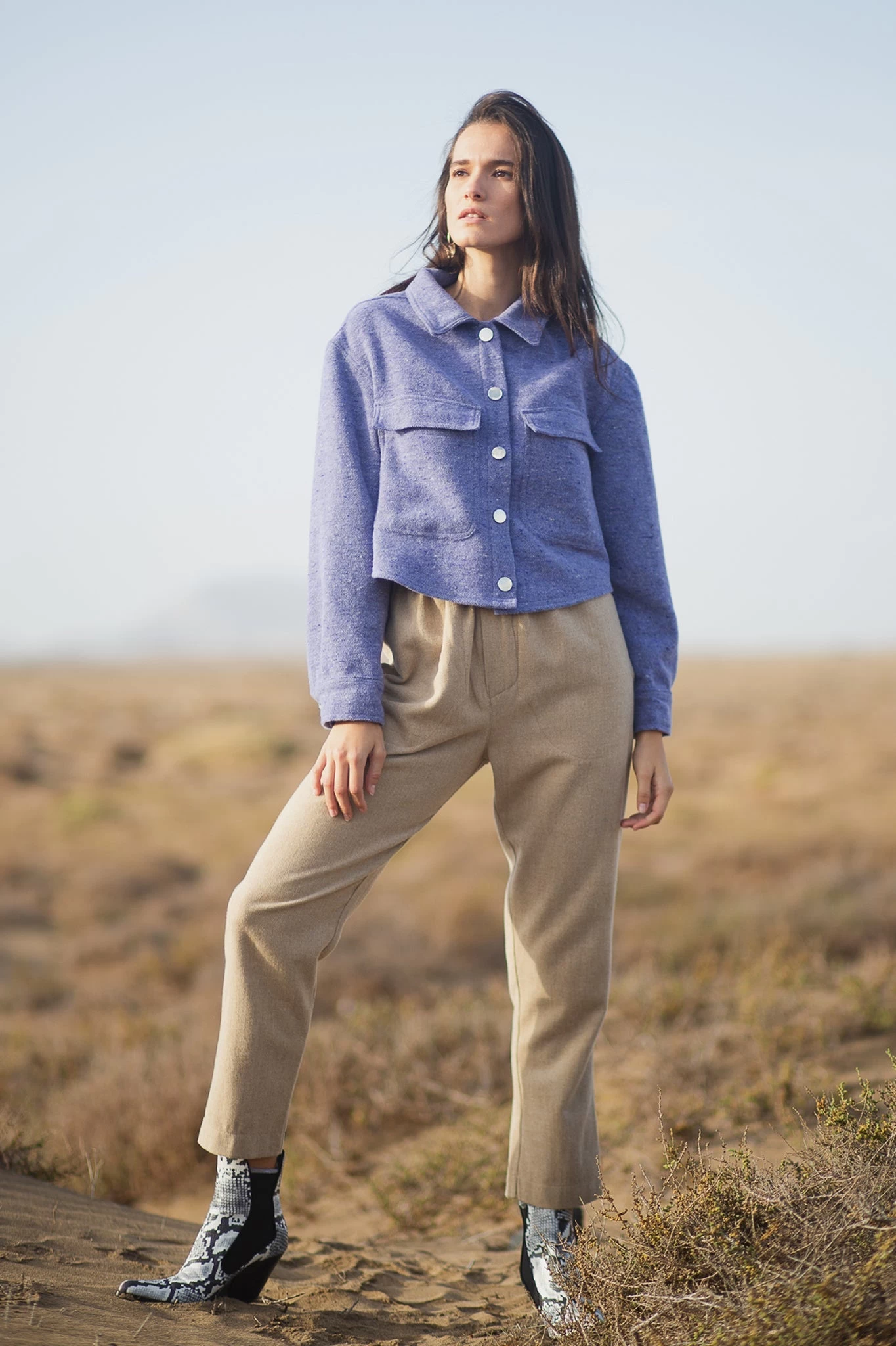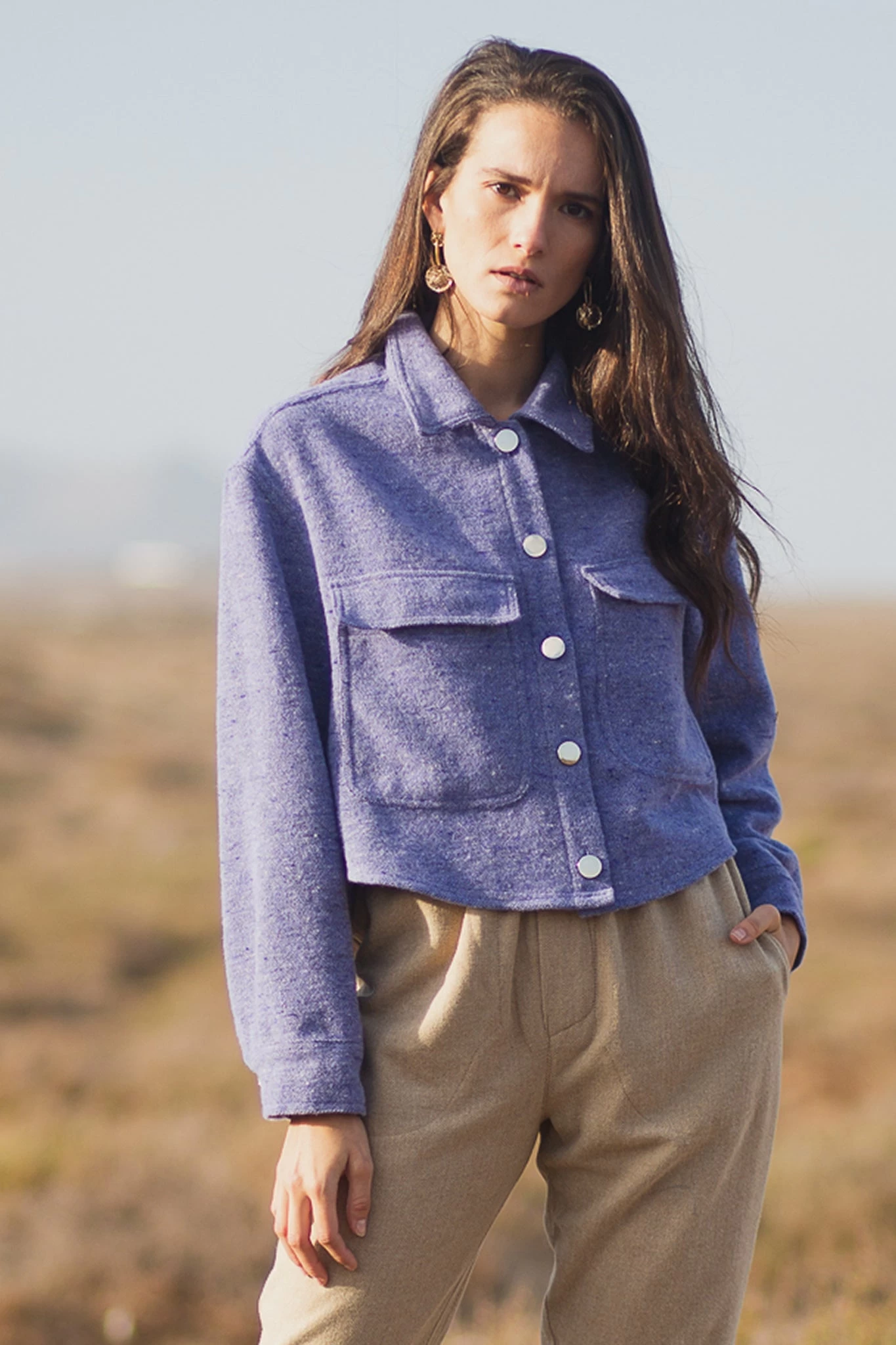 The timeless construction of Dina maintains its elegance with ease. This refreshing purple sweater features a woollen knit and a sumptuous design that you can pull off with all your bottoms. The collared neckline and a button-down front with long sleeves. The wide chest pockets bring attention to the cropped style of this sweater.