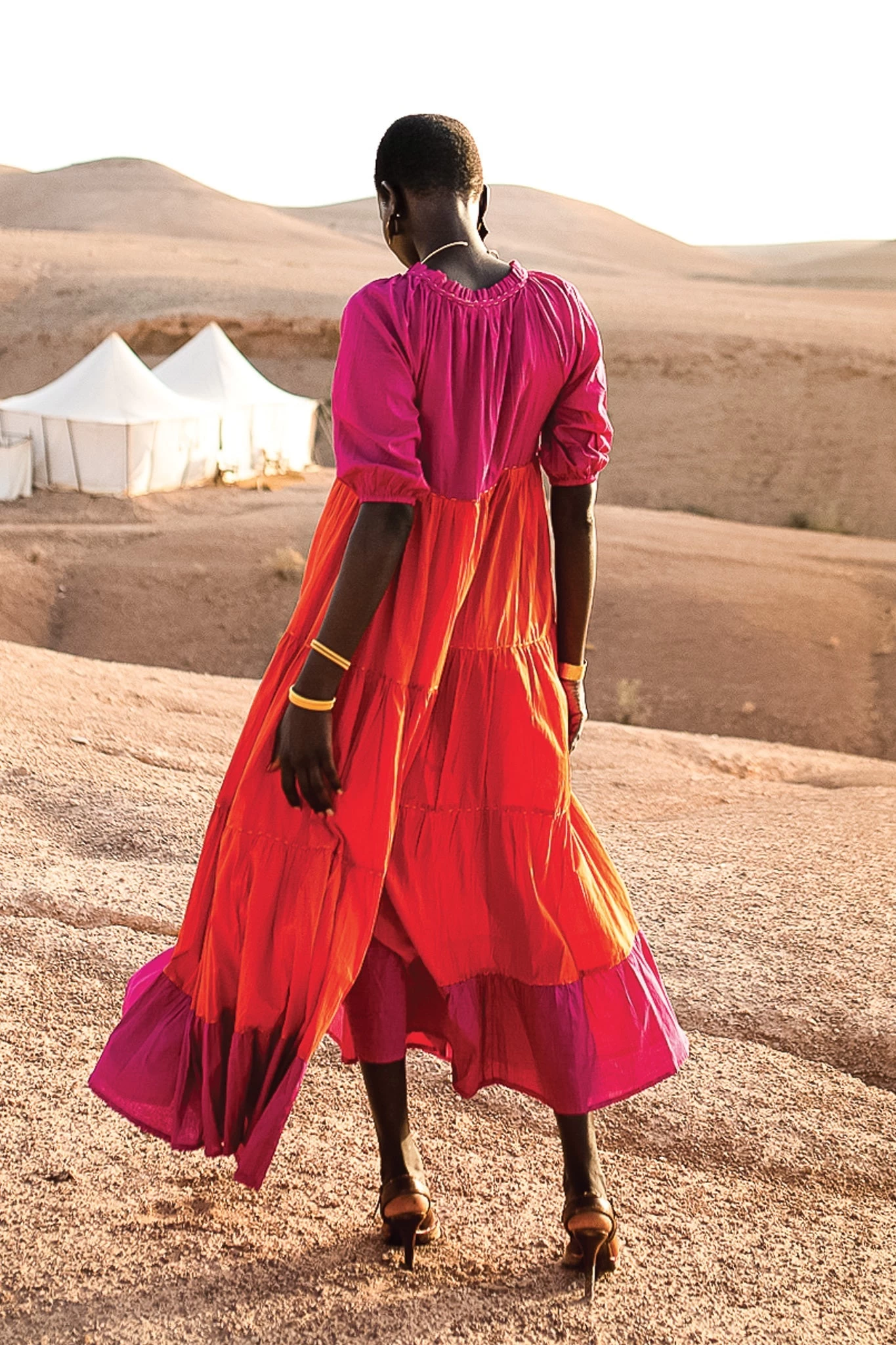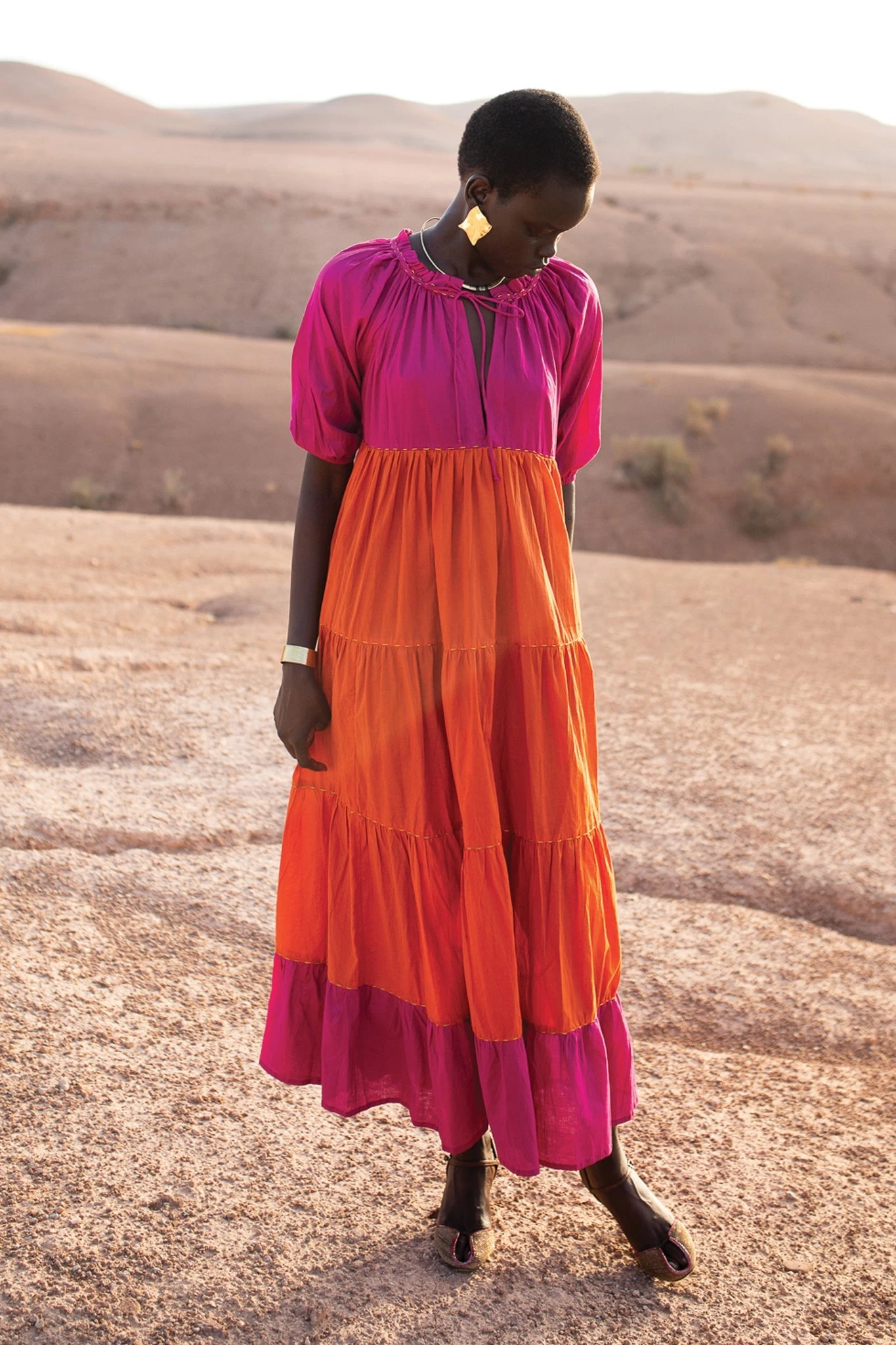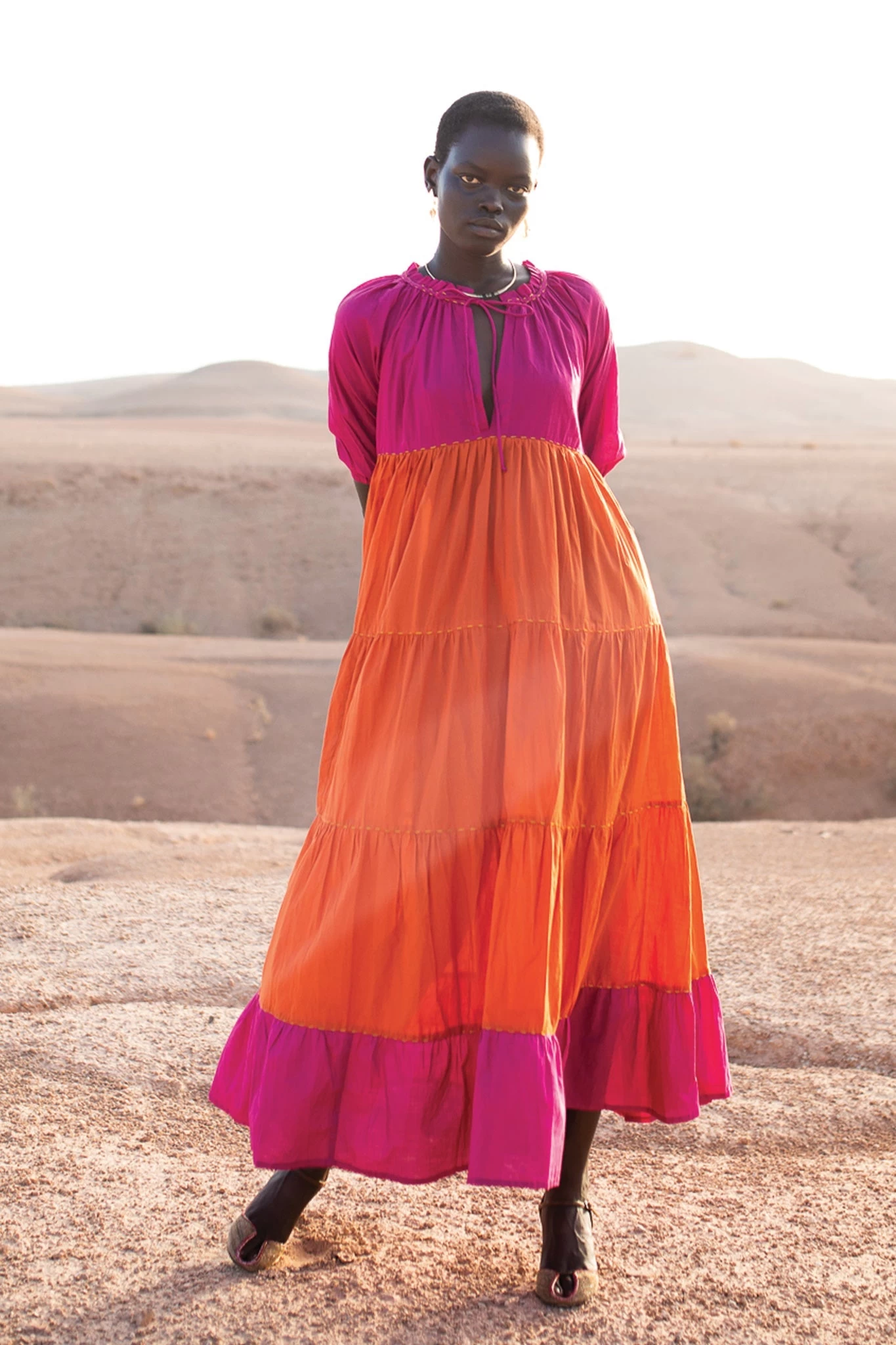Emiri a un style contemporain avec un charme d’antan. Confectionné dans une étoffe légère, ce maxi free tombe dans un flair ample qui semble être un murmure contre la peau. L’encolure à volants donne de la dimension à un corsage autrement indéfini, doté d’une coupe en V et de manches courtes bouffantes. La jupe à volants met en valeur le savoir-faire artisanal de la beauté thaïlandaise. Vous pouvez l’assortir d’un charmant imprimé floral ou d’une palette de blocs de couleurs astucieuse.