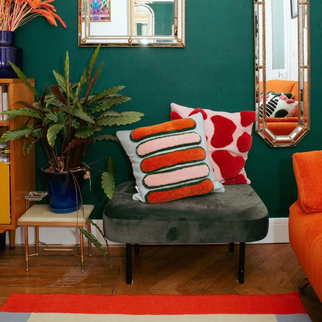 La housse de coussin en laine Eclair de Génie est une création ColorTherapis. Entièrement tissée à la main, elle est réalisée à partir des chutes de tissus de nos tapis en laine.