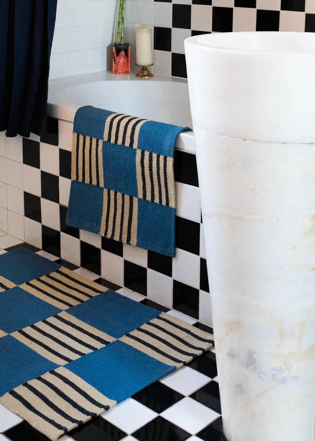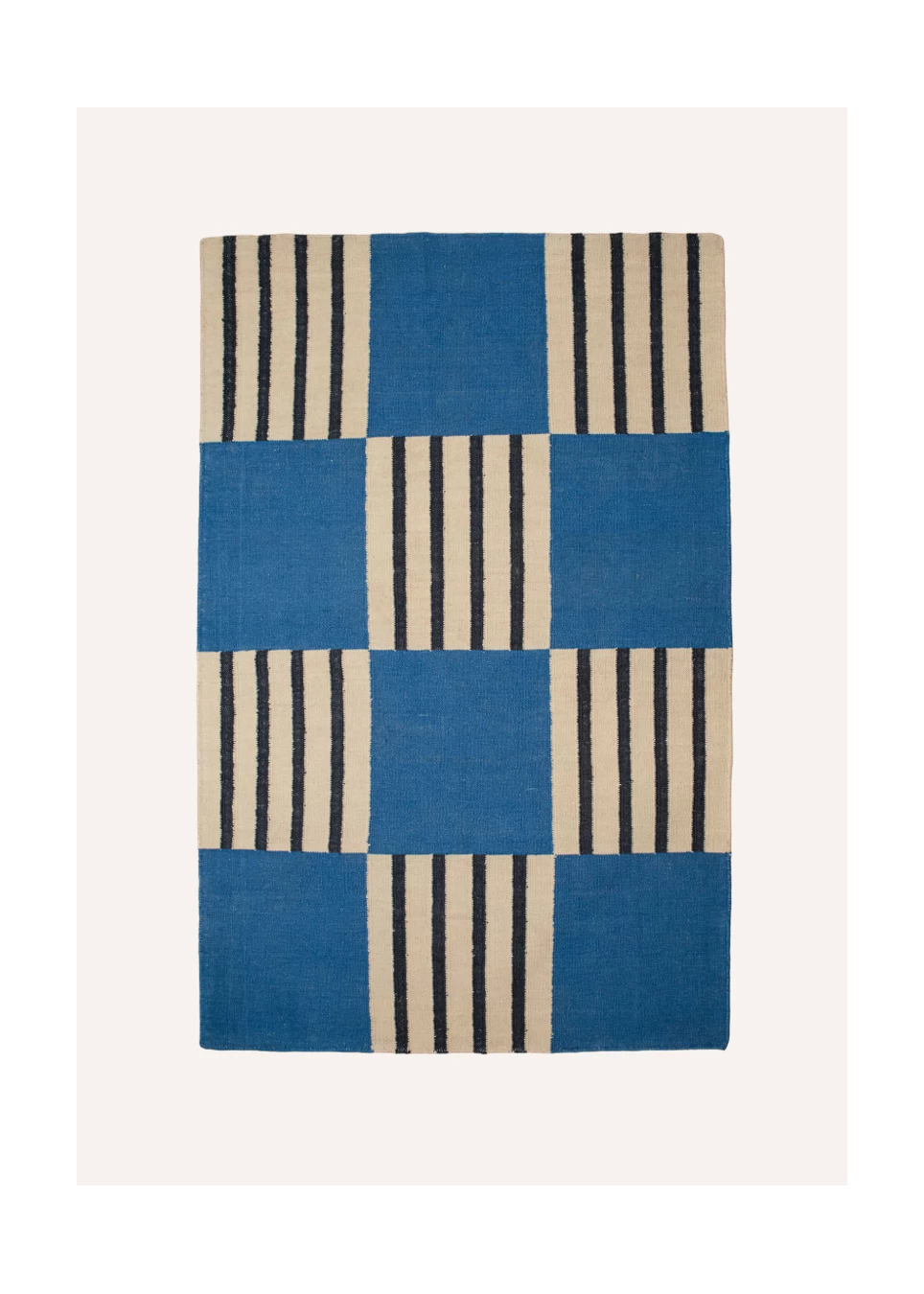 Le design Blue Paradoxe se décline également en tapis de plus grand format pour votre salon. Vous pourrez retrouver les plus grandes tailles de ce design dans la collection Tapis tissés à plat sur notre site.