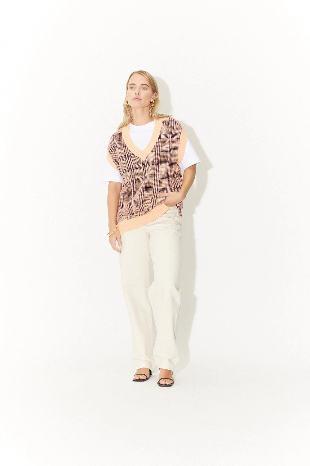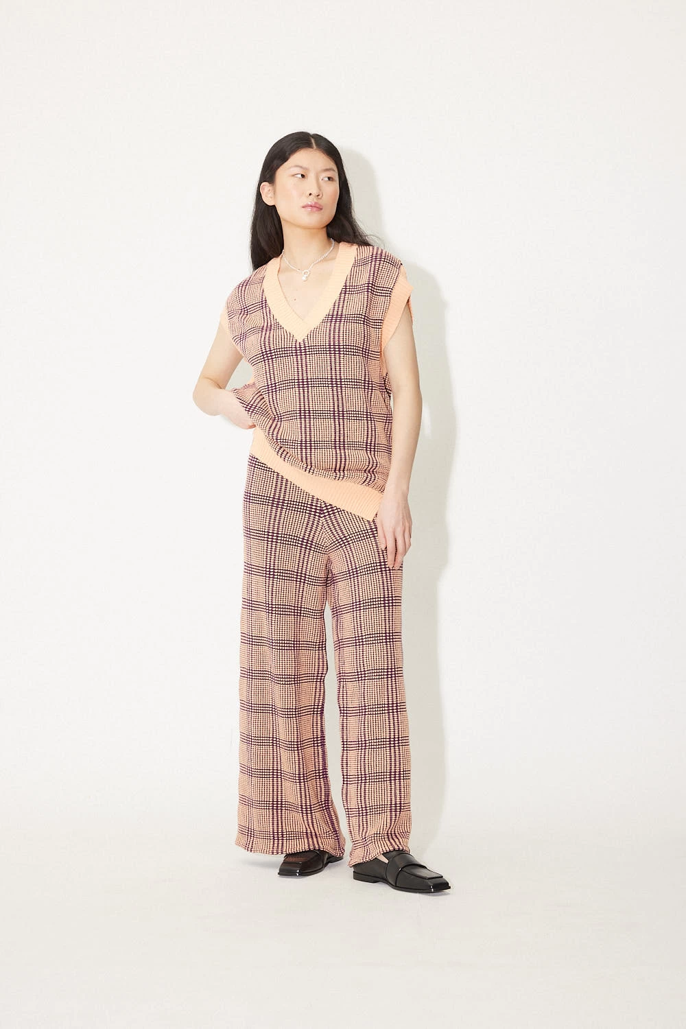 pull sans manches à carreaux bicolores en violet et saumon