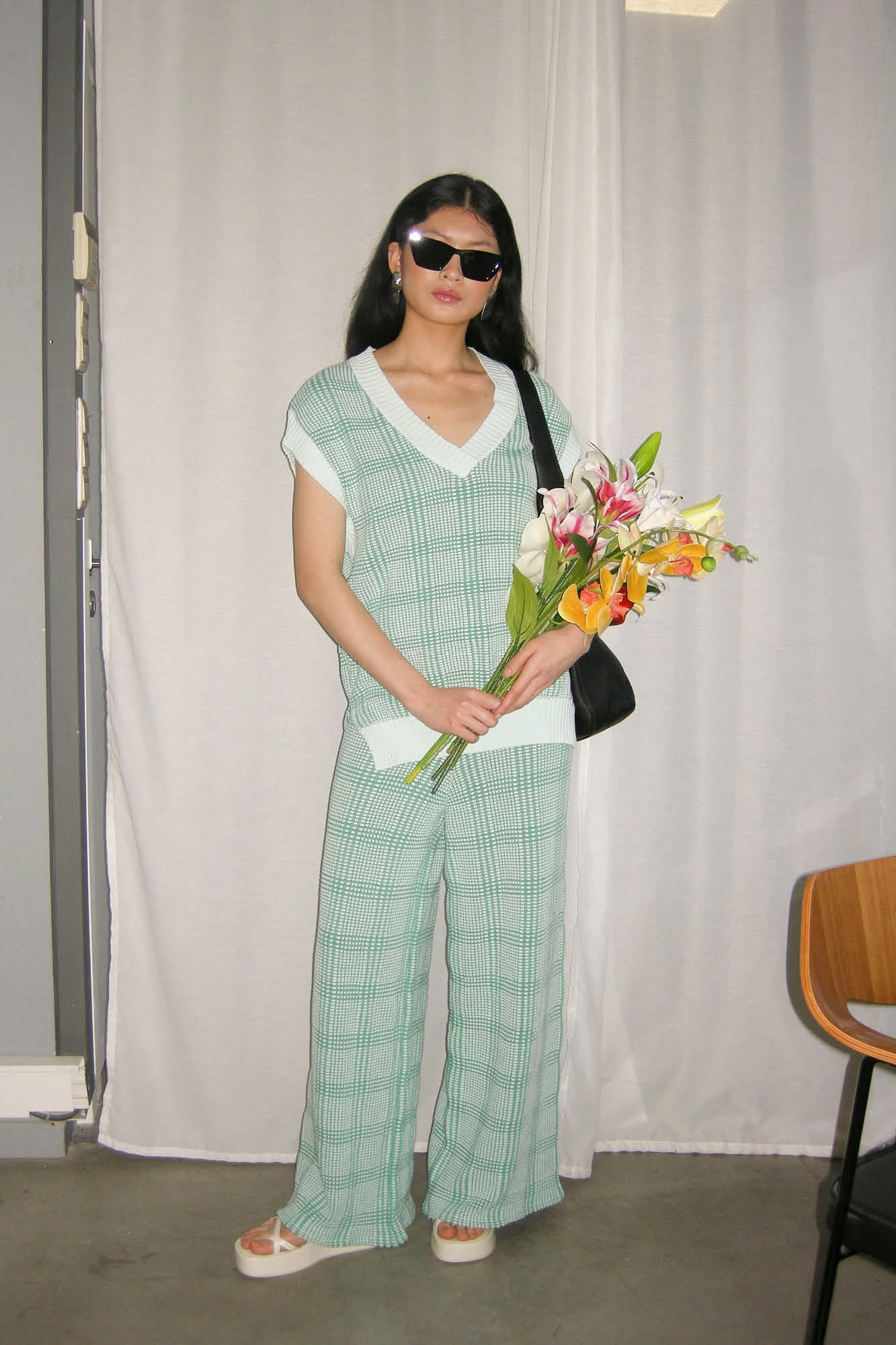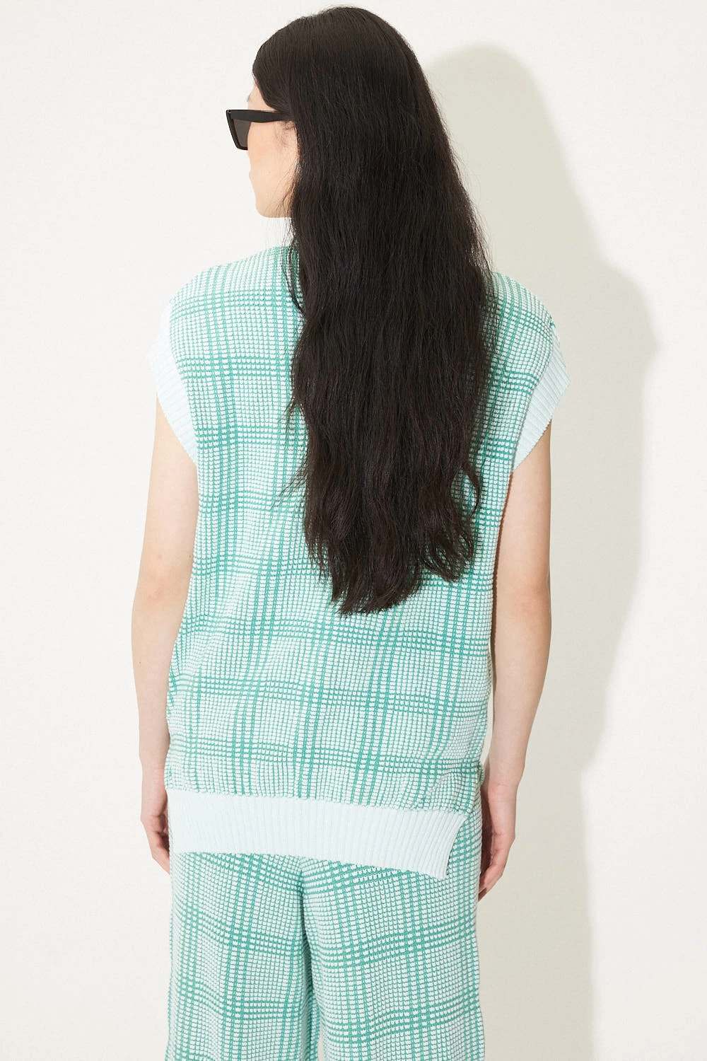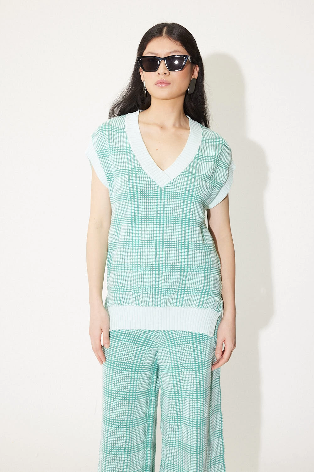 pull sans manches à carreaux bicolores, émeraude et bleu