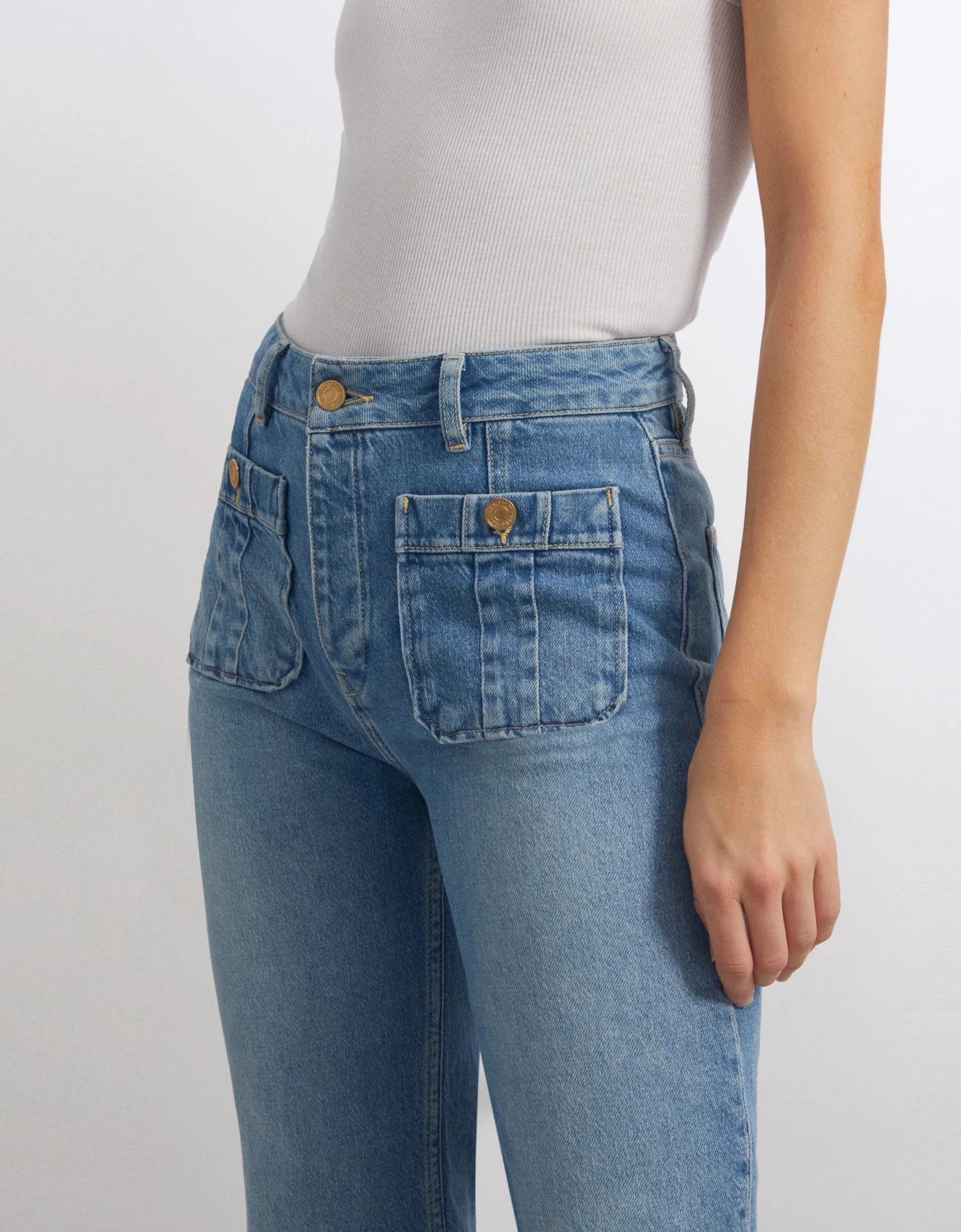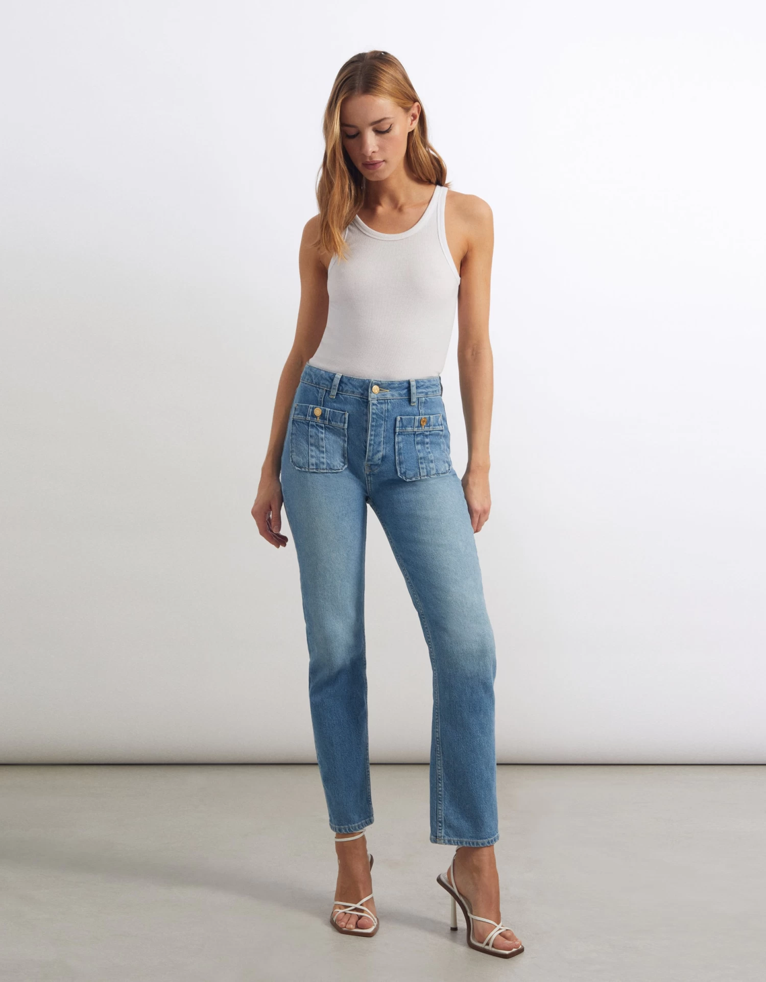 NELSY, notre nouveau jean straight qui sera votre nouveau compagnon Denim au quotidien. Le jean NELSY délavage B-344. Un jean taille haute qui adopte une coupe droite et donne un style rétro assumé grâce à sa taille emboîtante. On note sa pointe d’originalité grâce à ses découpes devant et ses poches géométriques.