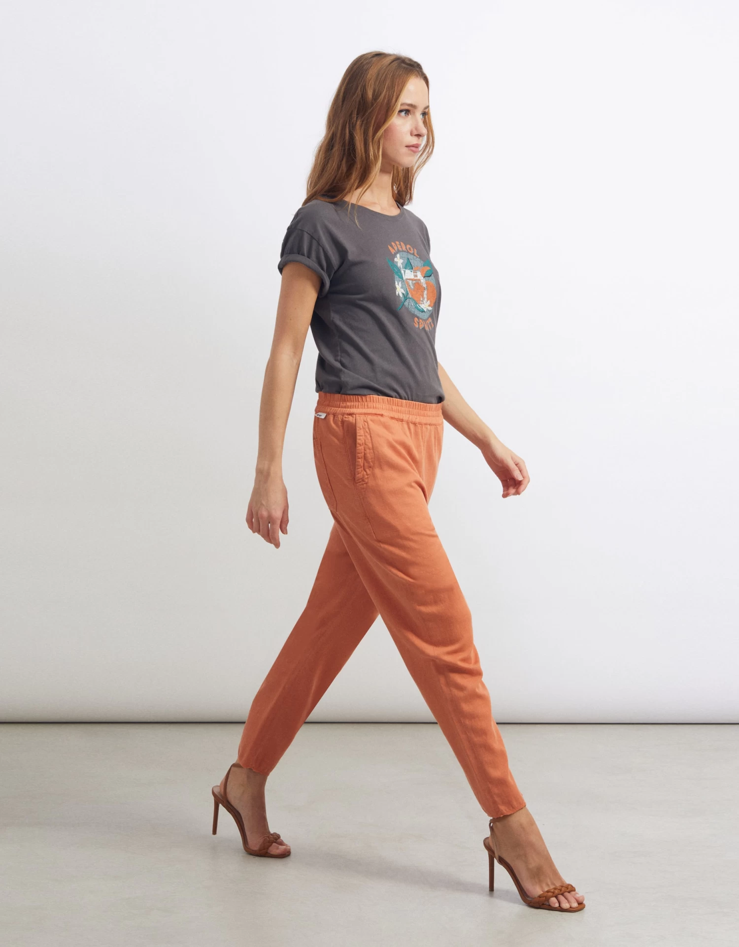 • Taille élastique, bas de jambe avec bords francs effilochés, poches plaquées dos.