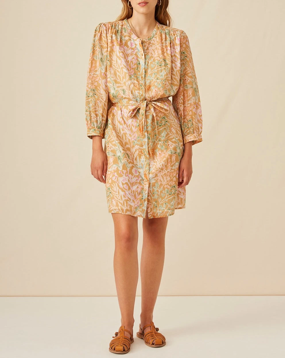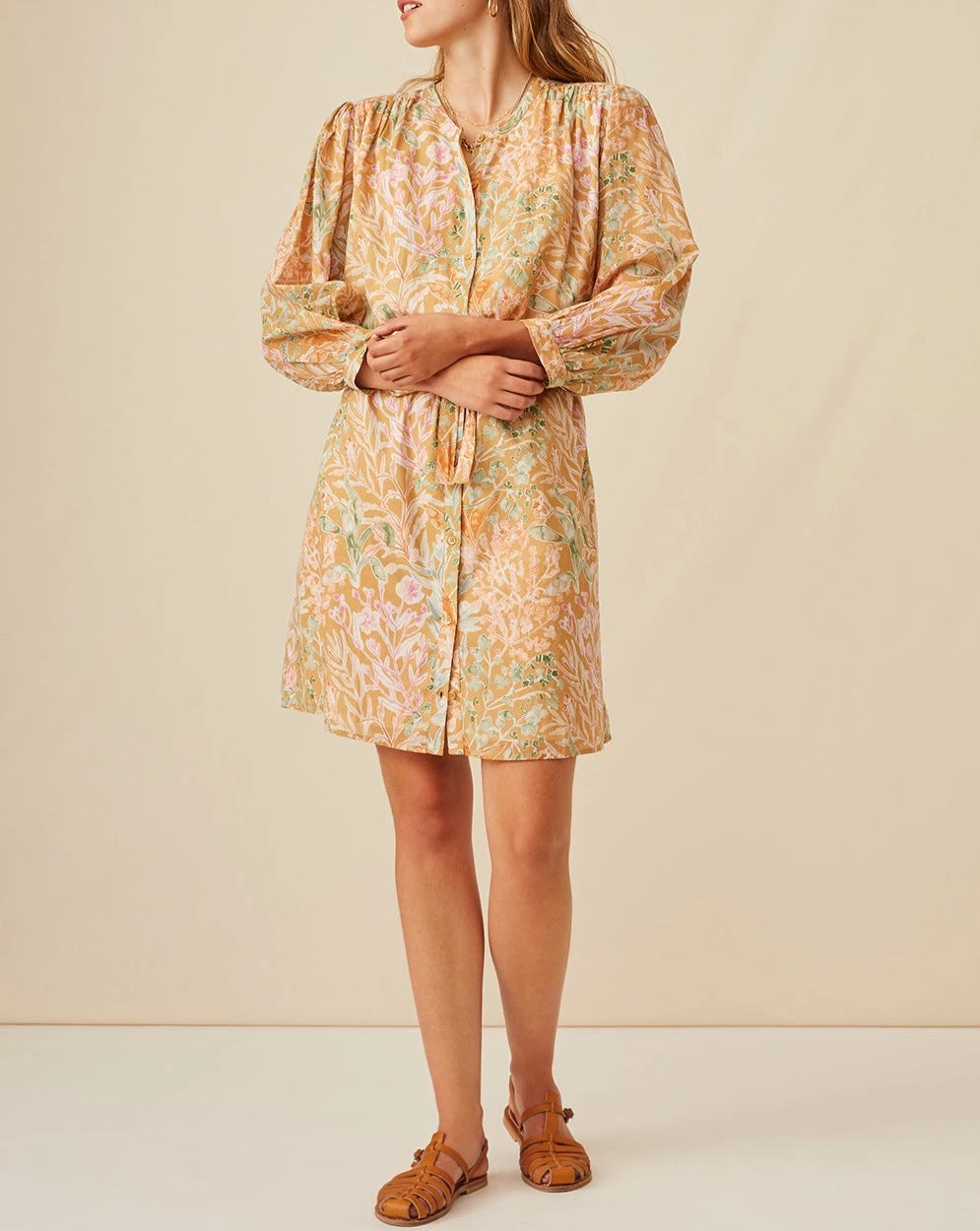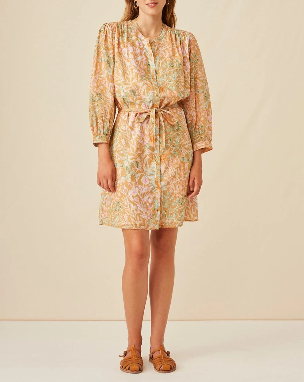 • Robe courte boutonnée à encolure ronde.