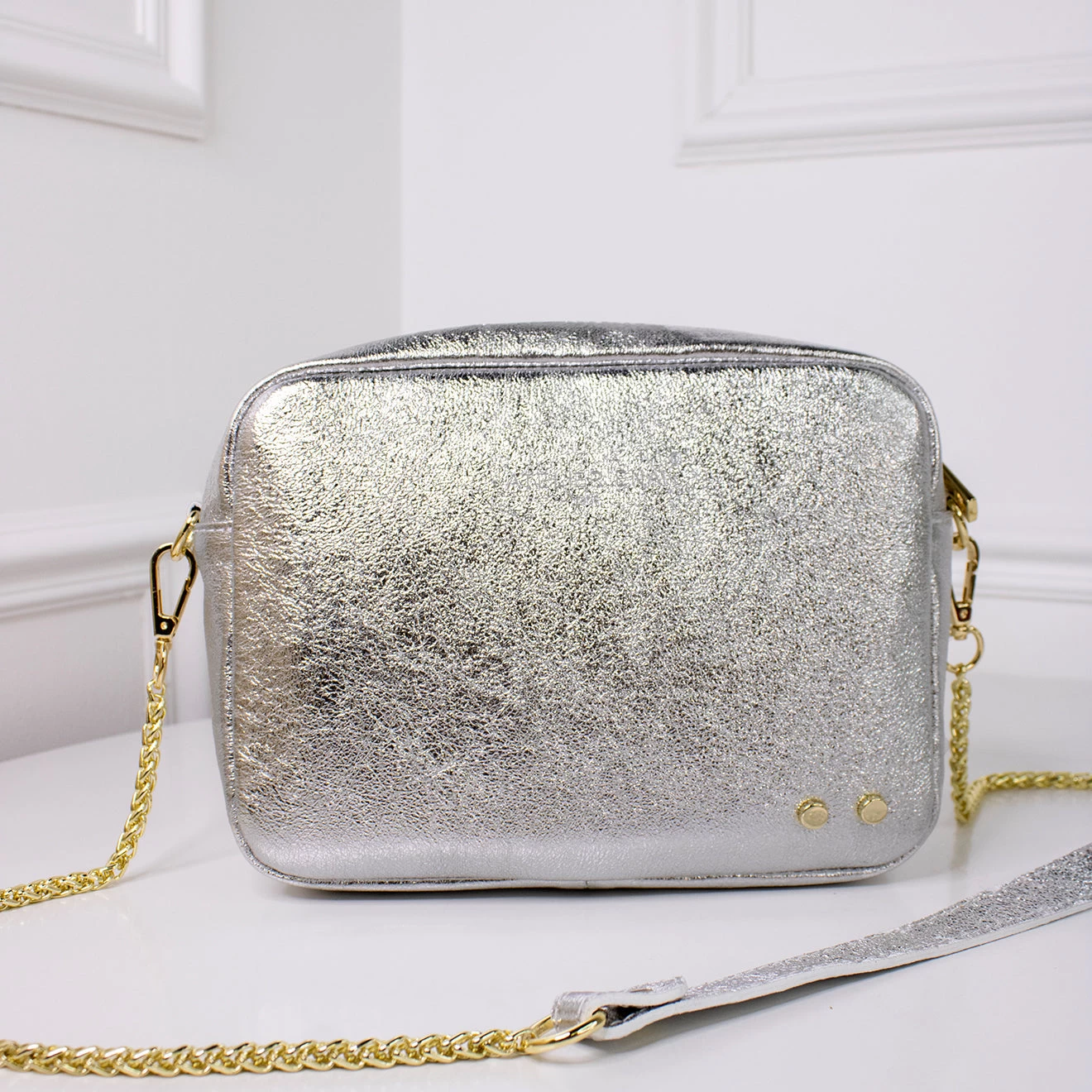 Sac à bandoulière avec détails en chaîne réglable. Ouverture fermeture éclair. Intérieur : petite poche. Extérieur : poche zippée au dos du sac.