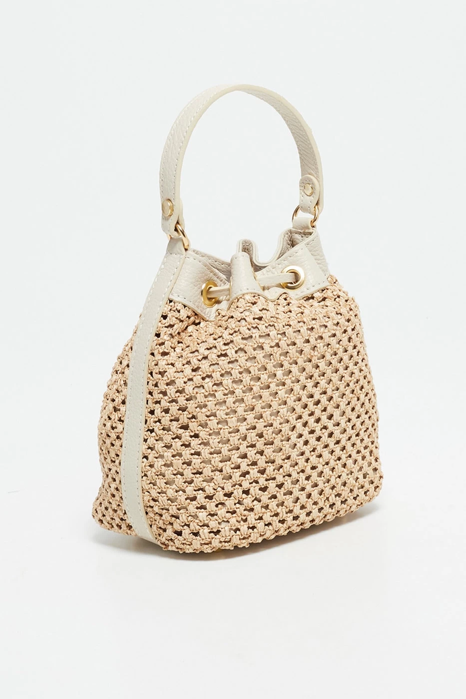 Sac seau en osier avec empiècements en cuir. Fermeture par cordon à serrage.