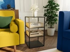 Le mélange des matières, on connaît. Le mélange des genres, on connaît aussi. Avec la sellette design Lazare, vous avez les deux, et mieux encore. Avec sa conception qui mêle le métal noir et le bambou, ce petit meuble contemporain se teinte de particularités qui font la différence. Ce sont notamment ses plateaux intermédiaires qui retiennent l’attention. Ils sont deux, ce qui est relativement peu courant sur une sellette haute et en prime, ils sont imaginés comme des corbeilles en bambou. Bingo ! Non seulement la sellette en métal et bambou Lazare peut accueillir du rangement, mais en plus, elle est originale et créative. Un élément décoratif qui fait mouche au premier coup d’œil.
