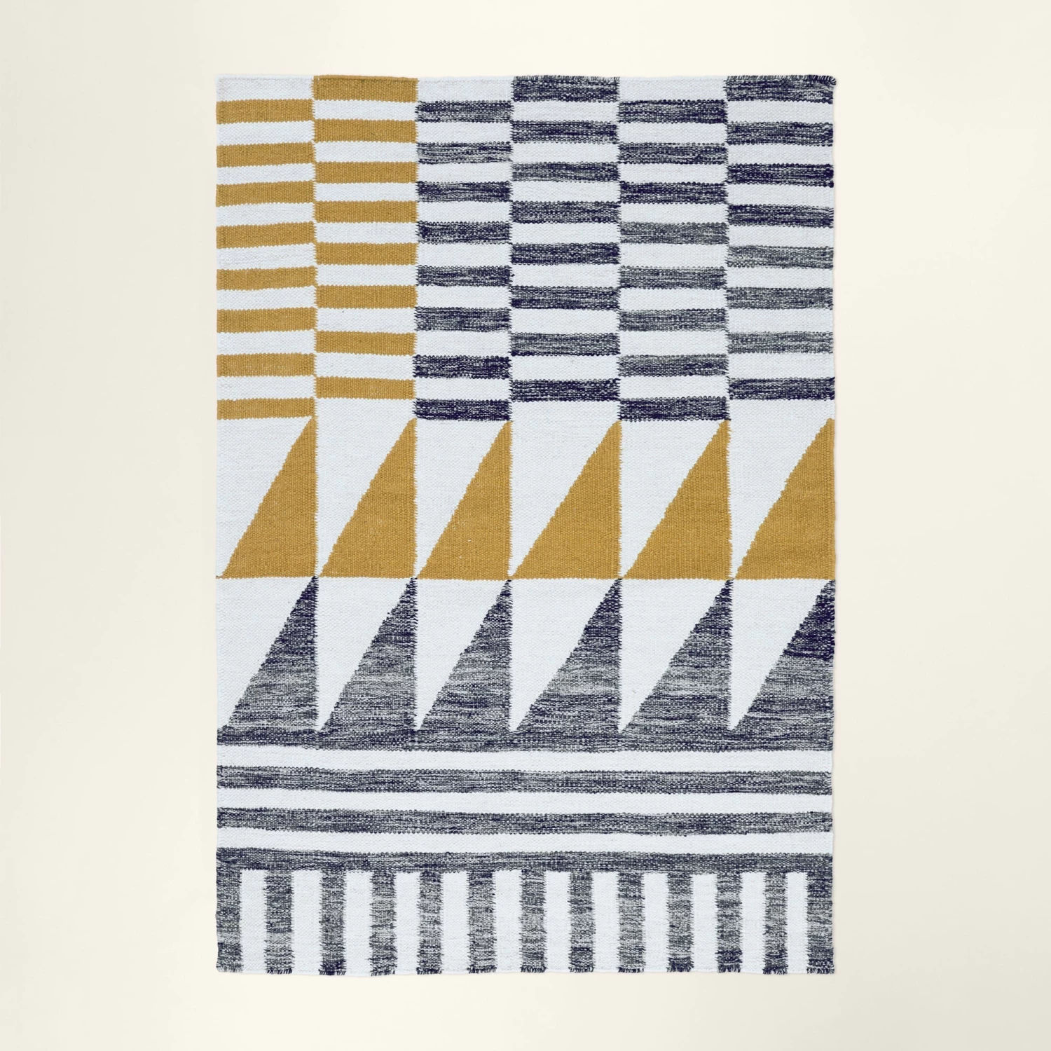 Notre modèle de tapis Aksel aux tons gris et ocre s’intègrera parfaitement dans un environnement moderne.