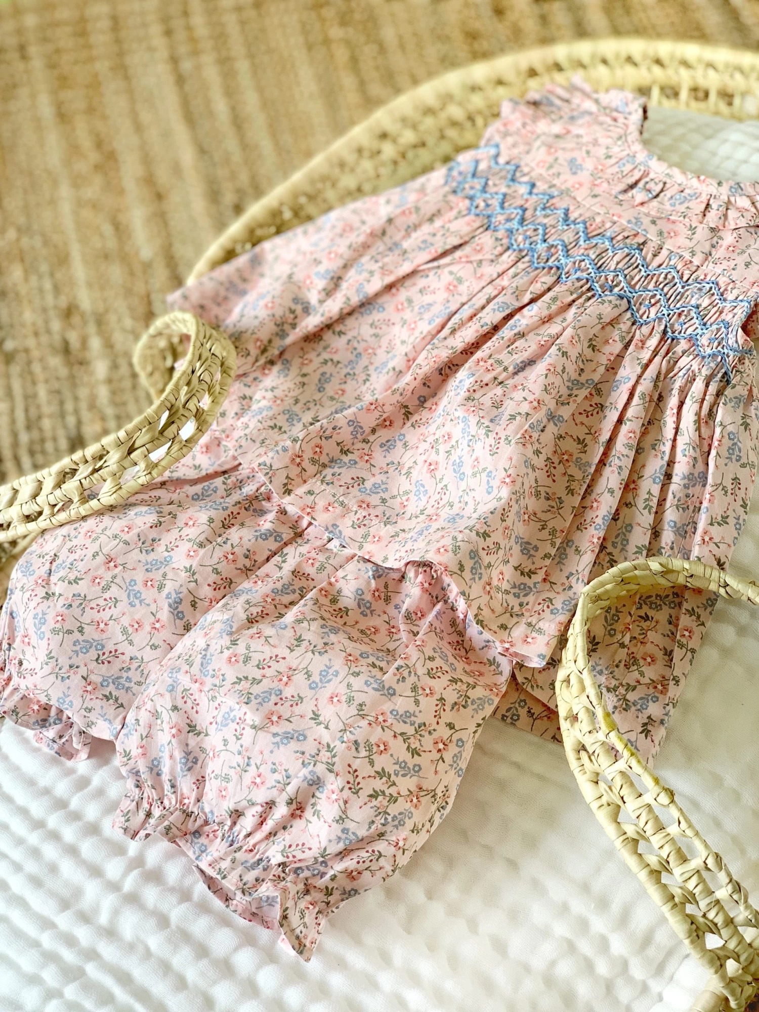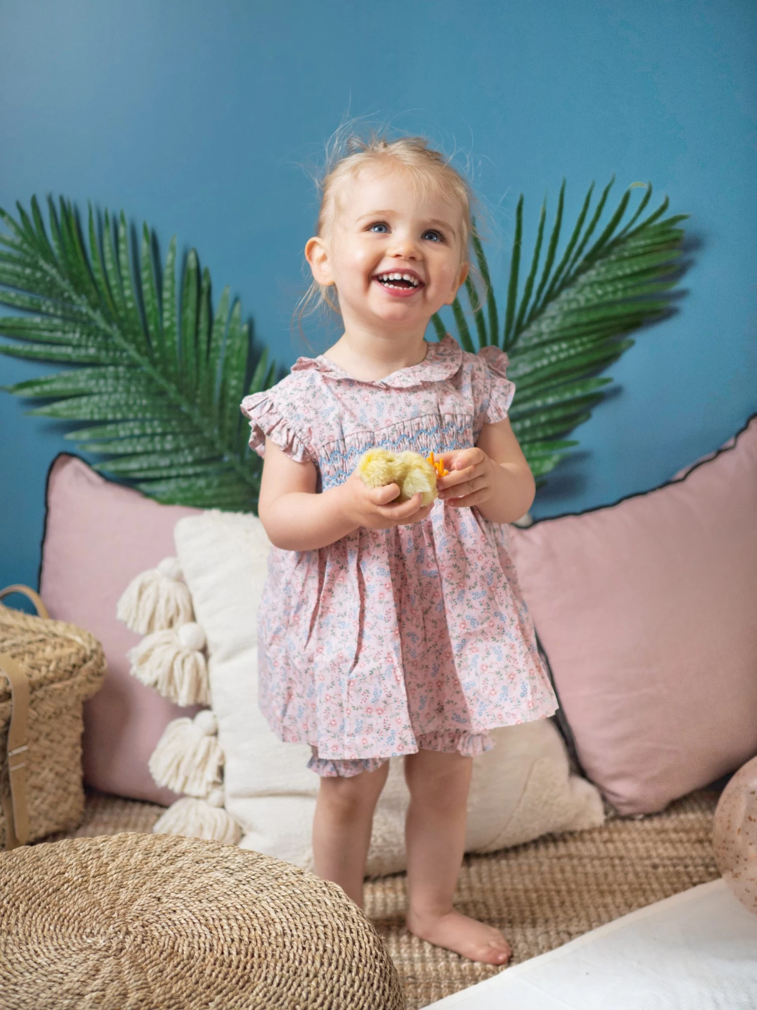 Son petit haut à volants au niveau de l’encolure et des manches arbore parfaitement ses smoks bleutés. Il est parfaitement assorti à son petit bloomer.