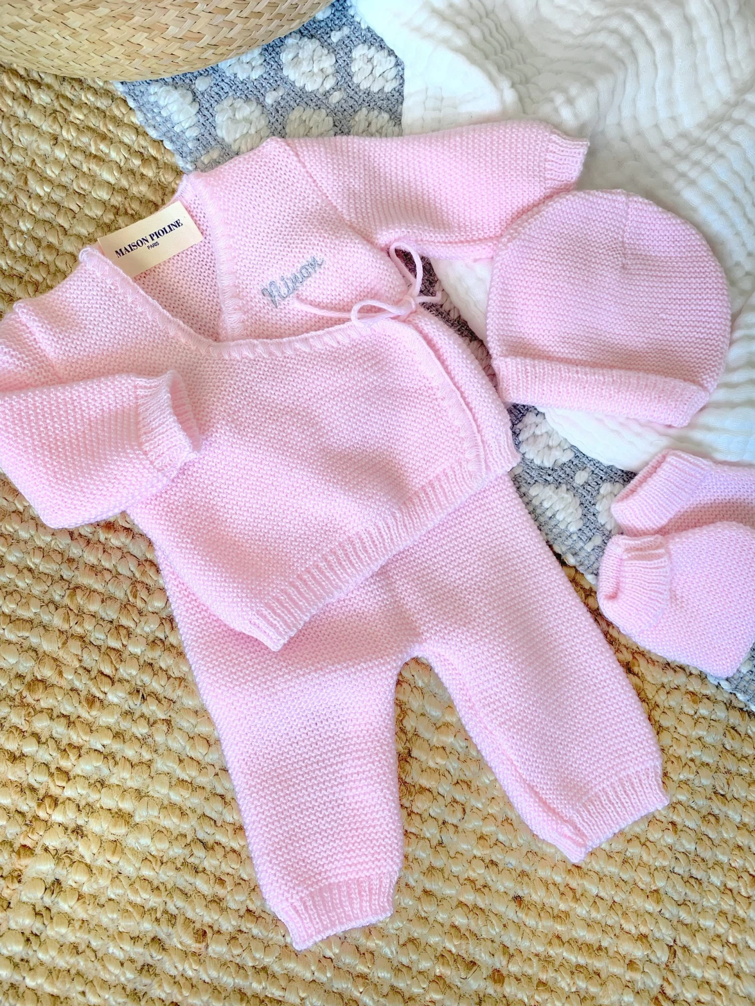 Un trousseau de naissance complet, tricoté en point mousse pour les premiers mois de bébé. Cette tenue complète et moelleuse est un véritable cocon de confort, très agréable à porter. Une tenue adaptée à toutes les saisons.